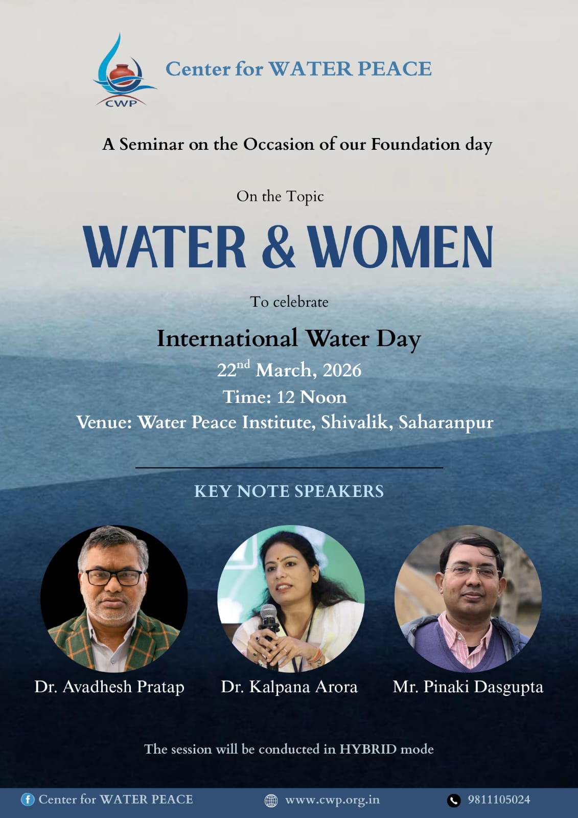 Informal establishment of Center for WATER PEACE happened on The Water Day, March 22nd, 2020, When Covid happened in the initial phase of lock down. Formal existence happened when CWP became as an trust on 29 Dec. 2020. Since CWP inception leading institutions has been associates in several projects and activities. Water is a great connector and peace building medium, CWP was conceptualized for amplifying the vision of water conservation through dialogue and deliberations and keeping History, science, culture and technological aspects into consideration. CWP having wide spectrum of members of all major stakeholders from homemakers to Industry professionals.